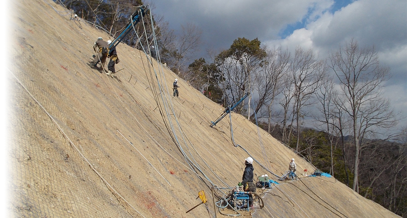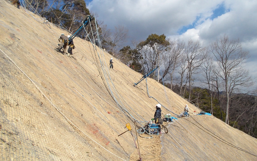 法面工事とは、人工斜面・自然斜面がくずれないように落石予防、保護するための工事を言います。