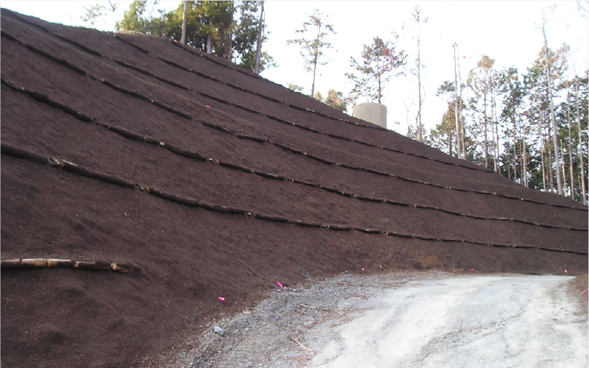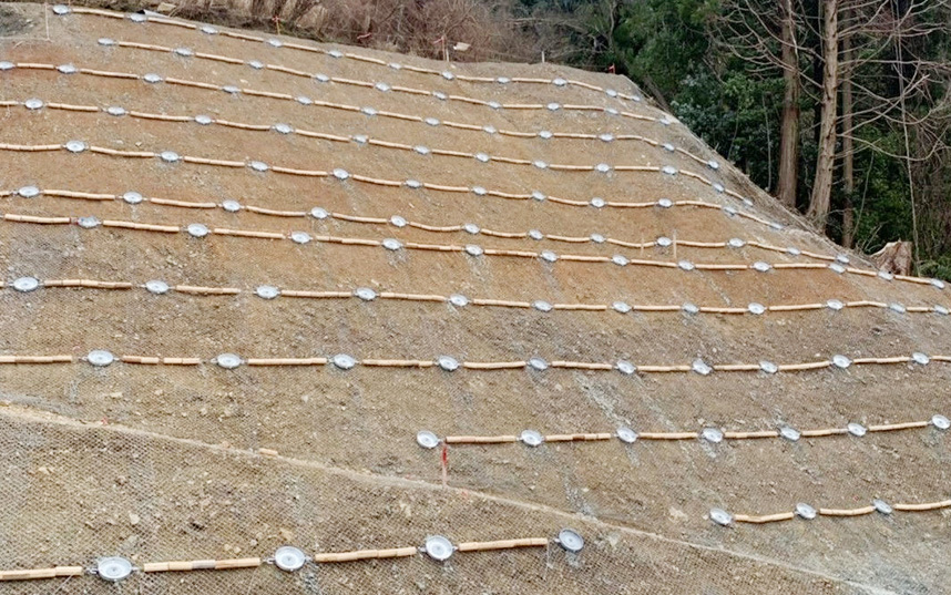 間伐材にワイヤーロ-プを通し数珠状にしたものを法面に階段状に設置することで緑化を促進する植生基盤工法。