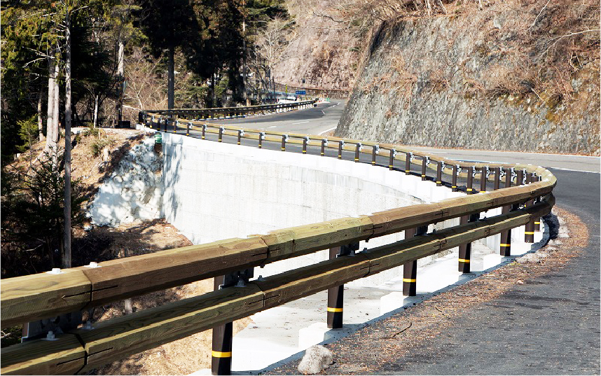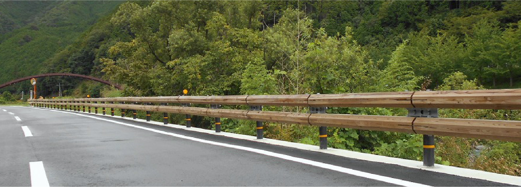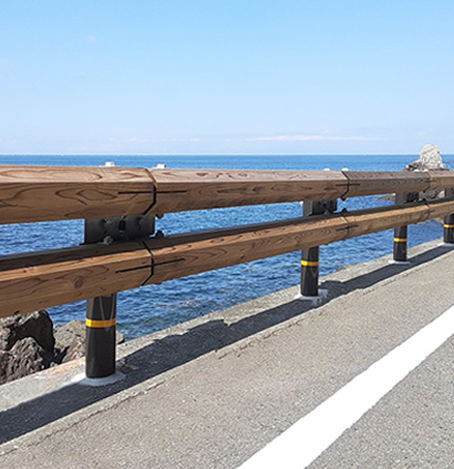 景観に配慮し、環境に優しい道路づくりのために開発した、和歌山県で初めての木製ガードレールです。和歌山県では平成29年度から高野山や白浜町などの主要観光地の幹線道路のガードレールを順次、木造化するとしています。紀州材の利用促進と観光振興の観点から景観に配慮するのが目的です。